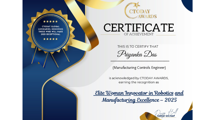 This trailblazing leader has carved a stellar career in the automotive manufacturing industry, combining technical expertise and innovative approaches to revolutionize processes. Priyanka Das’s contributions were recognized in 2025 when she was awarded the prestigious “Elite Woman Innovator in Robotics and Manufacturing Excellence” by CToday Awards. Her ability to lead complex projects, reduce cycle times, and drive collaboration across teams has positioned her as a standout leader in robotics and manufacturing.