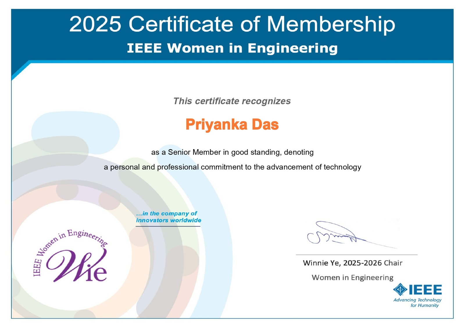 Priyanka Das holds the distinguished status of Senior Member of IEEE—a recognition bestowed upon accomplished professionals demonstrating exceptional dedication to advancing technology. This accolade reflects her unwavering commitment to innovation, leadership, and impact within the global engineering community. Additionally, as a certified Senior Member of IEEE Women in Engineering (WIE) for 2025–2026, she plays a pivotal role in empowering women in STEM and fostering inclusive excellence in the tech industry. Her dual recognition by IEEE and WIE places her among a select cadre of global innovators, honoring her technical contributions and advocacy for a more equitable future in engineering and research.