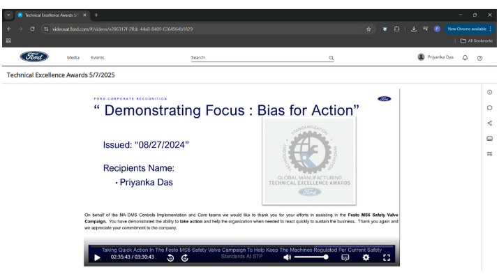 Priyanka Das received the Technical Excellence Award from Ford Motor Company on August 27, 2024, for her swift and impactful contributions to the Festo MS6 Safety Valve Campaign. Recognized by the NA DMS Controls Implementation and Core teams, she was commended for her quick action, dedication, and commitment to sustaining critical business operations.